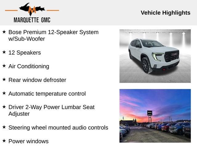 We look forward to working with you. We service all the following counties Marquette, Mackinac, Chippewa, Luce, Alger, Schoolcraft, Delta, Menominee Michigan, Dickinson, Iron, Baraga, Houghton, Keweenaw, Ontonagon, Gogebic, Emmit, Cheboygan, Marinette WI, Florence WI, Oconto WI, Menominee WI, Brown WI, Iron WI, Ashland WI, Bayfield WI Forest WI. Check out the rest of this vehicle's features Floor Liner Package (LPO) (1st & 2nd Row All-Weather Floor Liner (LPO), 3rd Row All-Weather Floor Liner (LPO), and Integrated Cargo Liner (LPO)), Luxury Package (8 Diagonal Head-Up Display, Heated & Ventilated Driver & Front Passenger Seats, Heated Rear Outboard Seating Positions, Heated Wiper Park, and Laminated Acoustic Glass), AWD, Forest Storm W/Mahogany Accents Cloth, 12 Speakers, 3rd row seats: split-bench, 7-Passenger Seating (2-2-3 Seating Configuration), Air Conditioning, Apple CarPlay/Android Auto, Auto-dimming Rear-View mirror, Automatic temperature control, Bose Premium 12-Speaker System w/Sub-Woofer, Delay-off headlights, Driver 2-Way Power Lumbar Seat Adjuster, Exterior Parking Camera Rear, Front fog lights, Front Passenger Power Lumbar Seat Adjuster, Heated Driver & Front Passenger Seats, Panoramic Power Sunroof w/Sunshade, Power door mirrors, Power driver seat, Power Liftgate, Power steering, Power windows, Rear window defroster, Sport steering wheel, Steering wheel mounted audio controls, Tachometer, Telescoping steering wheel, Voltmeter, 3.49 Final Drive Axle Ratio, 4-Wheel Disc Brakes, 6-Way Power Front Passenger Seat Adjuster, 8-Way Power Driver Seat Adjuster, ABS brakes, Alloy wheels, AM/FM radio: SiriusXM with 360L, Auto High-beam Headlights, Black Nameplate Kit (LPO), Bodyside moldings, Brake assist, Bumpers: body-color, Cloth/CoreTec Seat Trim, Compass, Driver door bin, Driver vanity mirror, Dual front impact airbags, Dual front side impact airbags, Electronic Stability Control, Emergency communication system: OnStar Services capable, Four wheel independent suspension, Front anti-roll bar, Front Bucket Seats, Front Center Armrest, Front dual zone A/C, Front License Plate Bracket, Front reading lights, Fully automatic headlights, Garage door transmitter, Heated door mirrors, Heated front seats, Heated steering wheel, Illuminated entry, Leather steering wheel, Low tire pressure warning, Molded Front & Rear Splash Guards (LPO), Navigation System, Occupant sensing airbag, Outside temperature display, Overhead airbag, Overhead console, Panic alarm, Passenger door bin, Passenger vanity mirror, Power passenger seat, Radio data system, Radio: 15 Premium GMC Infotainment System, Rear air conditioning, Rear anti-roll bar, Rear reading lights, Rear side impact airbag, Rear window wiper, Remote keyless entry, Security system, SiriusXM w/360L, Speed control, Speed-sensing steering, Split folding rear seat, Spoiler, Tilt steering wheel, Traction control, Trip computer, Turn signal indicator mirrors, Variably intermittent wipers, and Wheels: 18 x 8 Dark Machined Aluminum.