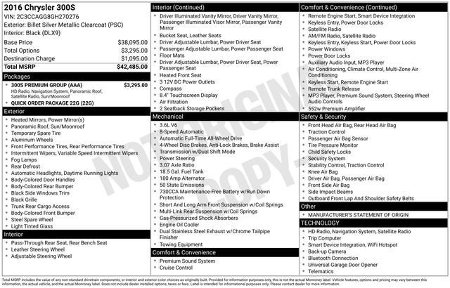 Powered by a 3.6L 6-Cylinder engine paired with an 8-Speed Automatic transmission, this 300S delivers a smooth and responsive ride, while the available All-Wheel Drive system ensures confident handling in all weather conditions. The impressive fuel economy of 18 city/27 highway MPG further enhances the vehicle's practicality and efficiency.