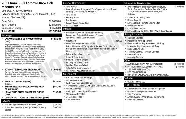 We look forward to working with you. We service all the following counties Marquette, Mackinac, Chippewa, Luce, Alger, Schoolcraft, Delta, Menominee Michigan, Dickinson, Iron, Baraga, Houghton, Keweenaw, Ontonagon, Gogebic, Emmit, Cheboygan, Marinette WI, Florence WI, Oconto WI, Menominee WI, Brown WI, Iron WI, Ashland WI, Bayfield WI Forest WI. Check out the rest of this vehicle's features Bed Utility Group (LED Bed Lighting, MOPAR Deployable Bed Step, and MOPAR Spray In Bedliner), Heavy Duty Snow Plow Prep Group, Laramie Level 2 Equipment Group (DISC) (1-Year SiriusXM Guardian Trial, 17 Speaker harman kardon Premium Sound, 2nd Row In Floor Storage Bins, 4G LTE Wi-Fi Hot Spot, 5-Year SiriusXM Traffic Service, 5-Year SiriusXM Travel Link Service, 8.4 Touchscreen Display, Apple CarPlay, Auto High Beam Headlamp Control, Blind Spot & Cross Path Detection (DISC), Disassociated Touchscreen Display, Exterior Mirrors w/Memory, Foam Bottle Insert (Door Trim Panel), For Details Visit DriveUconnect.com, Google Android Auto, GPS Antenna Input, GPS Navigation, HD Radio, Heated Second Row Seats, Integrated Center Stack Radio, Integrated Voice Command w/Bluetooth®, Mirror-Mounted Aux Reverse Lamps, Off-Road Information Pages, Power Adjustable Convex Aux Mirrors, Power Adjustable Pedals w/Memory, Power Chrome Tow Mirrors w/Convex Spotter & Memory, Radio: Uconnect 4C Nav w/8.4 Display, Radio/Driver Seat/Mirrors/Pedals Memory, Rain Sensitive Windshield Wipers, Remote Tailgate Release, Selectable Tire Fill Alert, SiriusXM Satellite Radio, SiriusXM Traffic Plus, SiriusXM Travel Link, and Ventilated Front Seats), Quick Order Package 21H Laramie, Towing Technology Group (DISC) (CTR Stop Lamp w/Cargo View Camera, Surround View Camera System, and Trailer Reverse Guidance), Electronic Stability Control, Front fog lights, Panic alarm, ParkView Rear Back-Up Camera, #1 Seat Foam Cushion, 10 Speakers, 115V Auxiliary Rear Power Outlet, 12 Touchscreen Display, 2 Way Rear Headrest Seat, 220 Amp Alternator, 3.73 Axle Ratio, 4 Way Front Headrests, 4-Wheel Disc Brakes, 5th Wheel/Gooseneck Towing Prep Group, ABS brakes, Active Noise Control System, Adjustable pedals, Air Conditioning, Air Suspension Decal, Alloy wheels, AM/FM radio: SiriusXM, Apple CarPlay/Android Auto, Auto Level Rear Air Suspension, Auto-dimming Rear-View mirror, Automatic temperature control, Brake assist, Bumpers: chrome, Center Hub, Compass, Dash Pass Thru Wire Circuits, Delay-off headlights, Driver door bin, Driver vanity mirror, Dual front impact airbags, Dual front side impact airbags, Electronically Controlled Throttle, Folding Flat Load Floor Storage, Front anti-roll bar, Front Bumper Sight Shields, Front Center Armrest w/Storage, Front dual zone A/C, Front reading lights, Front Seat Back Map Pockets, Fully automatic headlights, Garage door transmitter, Heated door mirrors, Heated Front Seats, Heated front seats, Heated Steering Wheel, Heated steering wheel, High Back Seats, I/P Mounted Auxiliary Switches, Illuminated entry, Leather steering wheel, Leather Trim 40/20/40 Bench Seat, Low tire pressure warning, MOPAR Front & Rear Rubber Floor Mats, Occupant sensing airbag, Outside temperature display, Overhead airbag, Overhead console, Passenger door bin, Passenger vanity mirror, Power 8-Way Adjustable Passenger Seat, Power Adjust 8-Way Driver Seat, Power Deployable Running Boards, Power door mirrors, Power driver seat, Power passenger seat, Power steering, Power windows, Radio data system, Radio: Uconnect 12.0 w/Navigation, Radio: Uconnect 4 w/8.4 Display, Rear 60/40 Folding Seat, Rear reading lights, Rear seat center armrest, Rear step bumper, Rear window defroster, Remote keyless entry, Security system,