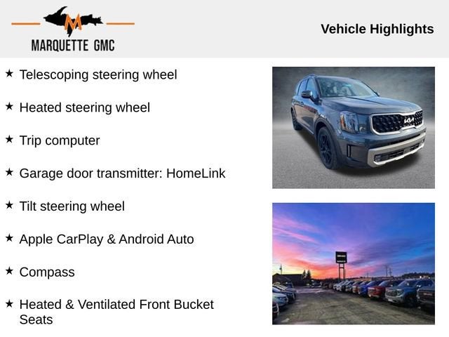 We look forward to working with you. We service all the following counties Marquette, Mackinac, Chippewa, Luce, Alger, Schoolcraft, Delta, Menominee Michigan, Dickinson, Iron, Baraga, Houghton, Keweenaw, Ontonagon, Gogebic, Emmit, Cheboygan, Marinette WI, Florence WI, Oconto WI, Menominee WI, Brown WI, Iron WI, Ashland WI, Bayfield WI Forest WI. Check out the rest of this vehicle's features 10 Speakers, 3rd row seats: split-bench, Apple CarPlay & Android Auto, Auto High-beam Headlights, Automatic temperature control, Compass, Exterior Parking Camera Rear, Front Bucket Seats, Front dual zone A/C, Front fog lights, Garage door transmitter: HomeLink, harman/kardon® Speakers, Heated & Ventilated Front Bucket Seats, Heated door mirrors, Heated steering wheel, Navigation System, Power driver seat, Power Liftgate, Power moonroof, Power passenger seat, Power steering, Power windows, Rear air conditioning, Rear window wiper, Reclining 3rd row seat, Security system, Speed control, Telescoping steering wheel, Tilt steering wheel, Trip computer, 3.648 Axle Ratio, 4-Wheel Disc Brakes, ABS brakes, Air Conditioning, Alloy wheels, AM/FM radio: SiriusXM, Auto-dimming Rear-View mirror, Brake assist, Bumpers: body-color, Delay-off headlights, Driver door bin, Driver vanity mirror, Dual front impact airbags, Dual front side impact airbags, Electronic Stability Control, Emergency communication system: 911 Connect, Four wheel independent suspension, Front anti-roll bar, Front Center Armrest, Front reading lights, Fully automatic headlights, Heated front seats, Illuminated entry, Knee airbag, Leather Seat Trim, Leather Shift Knob, Leather steering wheel, Low tire pressure warning, Memory seat, Occupant sensing airbag, Outside temperature display, Overhead airbag, Overhead console, Panic alarm, Passenger door bin, Passenger vanity mirror, Power door mirrors, Radio data system, Radio: AM/FM harman/kardon Audio System, Rear anti-roll bar, Rear audio controls, Rear reading lights, Rear side impact airbag, Rear window defroster, Remote keyless entry, Roof rack: rails only, Smart Key w/ Push Button and Remote Start, Speed-sensing steering, Split folding rear seat, Spoiler, Steering wheel mounted audio controls, Tachometer, Traction control, Turn signal indicator mirrors, Variably intermittent wipers, Ventilated front seats, and Wheels: 20 x 7.5 Black Finish.