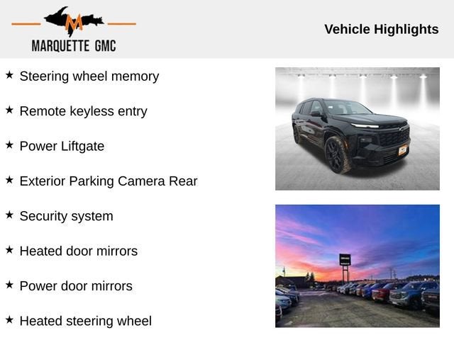 We look forward to working with you. We service all the following counties Marquette, Mackinac, Chippewa, Luce, Alger, Schoolcraft, Delta, Menominee Michigan, Dickinson, Iron, Baraga, Houghton, Keweenaw, Ontonagon, Gogebic, Emmit, Cheboygan, Marinette WI, Florence WI, Oconto WI, Menominee WI, Brown WI, Iron WI, Ashland WI, Bayfield WI Forest WI. Check out the rest of this vehicle's features Preferred Equipment Group 2RS, AWD, 12 Speakers, 3rd row seats: split-bench, Auto tilt-away steering wheel, Bose Premium 12-Speaker Audio System Feature, Driver 4-Way Power Lumbar Seat Adjuster, Driver door bin, Driver vanity mirror, Exterior Parking Camera Rear, Front Bucket Seats, Front dual zone A/C, Front Passenger 4-Way Power Lumbar Seat Adjuster, Front reading lights, Garage door transmitter, Heated door mirrors, Heated front seats, Heated steering wheel, Navigation System, Perforated Leather-Appointed Seat Trim, Power door mirrors, Power driver seat, Power Liftgate, Power windows, Rain sensing wipers, Rear air conditioning, Rear window wiper, Remote keyless entry, Security system, Steering wheel memory, Telescoping steering wheel, Tilt steering wheel, Trip computer, Ventilated front seats, Voltmeter, Wheels: 22 High Gloss Black Painted Aluminum, 4-Wheel Disc Brakes, 6-Way Power Front Passenger Seat Adjuster, 8-Way Power Driver Seat Adjuster, ABS brakes, Air Conditioning, Alloy wheels, AM/FM radio: SiriusXM with 360L, Apple CarPlay/Android Auto, Auto High-beam Headlights, Auto-dimming door mirrors, Automatic temperature control, Brake assist, Bumpers: body-color, Child-Seat-Sensing Airbag, Compass, Delay-off headlights, Dual front impact airbags, Dual front side impact airbags, Electronic Stability Control, Emergency communication system: OnStar, Four wheel independent suspension, Front anti-roll bar, Front Center Armrest, Fully automatic headlights, Heated rear seats, Illuminated entry, Low tire pressure warning, Memory seat, Occupant sensing airbag, Outside temperature display, Overhead airbag, Overhead console, Panic alarm, Passenger door bin, Passenger vanity mirror, Power passenger seat, Power steering, Radio data system, Rear anti-roll bar, Rear reading lights, Rear window defroster, Speed control, Speed-sensing steering, Spoiler, Sport steering wheel, Steering wheel mounted audio controls, Tachometer, Traction control, Turn signal indicator mirrors, and Variably intermittent wipers.
