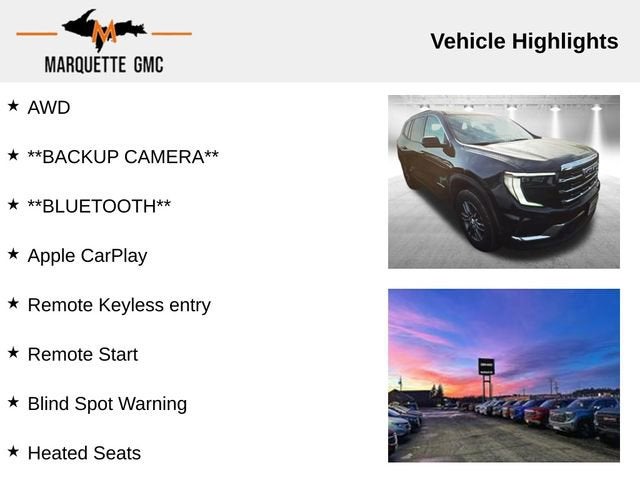 We look forward to working with you. We service all the following counties Marquette, Mackinac, Chippewa, Luce, Alger, Schoolcraft, Delta, Menominee Michigan, Dickinson, Iron, Baraga, Houghton, Keweenaw, Ontonagon, Gogebic, Emmit, Cheboygan, Marinette WI, Florence WI, Oconto WI, Menominee WI, Brown WI, Iron WI, Ashland WI, Bayfield WI Forest WI. Check out the rest of this vehicle's features Preferred Equipment Group 4SD, AWD, After Dark Cloth, 2-Way Driver Power Lumbar Seat Adjuster, 4-Way Manual Front Passenger Seat Adjuster, 8-Passenger Seating (2-3-3 Seating Configuration), 8-Way Power Driver Seat Adjuster, Apple CarPlay/Android Auto, Auto-dimming Rear-View mirror, Automatic temperature control, Bose Premium 12-Speaker System with Sub-Woofer, Compass, Front dual zone A/C, Front fog lights, Front reading lights, Heated Driver and Front Passenger Seats, Heated steering wheel, Illuminated entry, Navigation System, Panic alarm, Power driver seat, Power Liftgate, Power steering, Power windows, Rear air conditioning, Rear window defroster, Remote keyless entry, Speed control, Steering wheel mounted audio controls, Telescoping steering wheel, Tilt steering wheel, Trip computer, 12 Speakers, 18 x 7.5 Aluminum Wheels, 3.49 Final Drive Axle Ratio, 3rd row seats: split-bench, 4-Wheel Disc Brakes, ABS brakes, Air Conditioning, Alloy wheels, AM/FM radio: SiriusXM with 360L, Auto High-beam Headlights, Bodyside moldings, Brake assist, Bumpers: body-color, Cloth Seat Trim, Delay-off headlights, Driver door bin, Driver vanity mirror, Dual front impact airbags, Dual front side impact airbags, Electronic Stability Control, Emergency communication system: OnStar Services capable, Exterior Parking Camera Rear, Four wheel independent suspension, Front anti-roll bar, Front Bucket Seats, Front Center Armrest, Front License Plate Bracket, Fully automatic headlights, Heated door mirrors, Heated front seats, Leather steering wheel, Low tire pressure warning, Occupant sensing airbag, Outside temperature display, Overhead airbag, Overhead console, Passenger door bin, Passenger vanity mirror, Power door mirrors, Radio data system, Radio: 15 Diagonal Premium GMC Infotainment System, Rear anti-roll bar, Rear reading lights, Rear seat center armrest, Rear side impact airbag, Rear window wiper, Security system, SiriusXM with 360L, Speed-sensing steering, Split folding rear seat, Spoiler, Sport steering wheel, Tachometer, Traction control, Turn signal indicator mirrors, Variably intermittent wipers, and Voltmeter.
