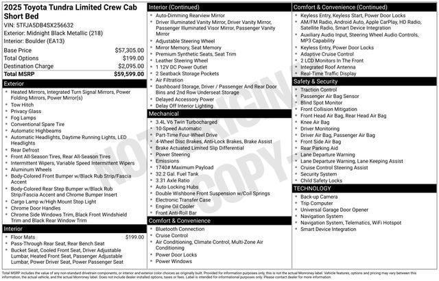 Designed with both work and play in mind, the 2025 Tundra Limited offers a versatile blend of capability and comfort. The robust 4x4 system and available off-road features make it the perfect companion for your outdoor adventures, while the advanced safety technologies, including Blind Spot Monitoring and Rear Cross-Traffic Alert, provide added peace of mind on the road.
